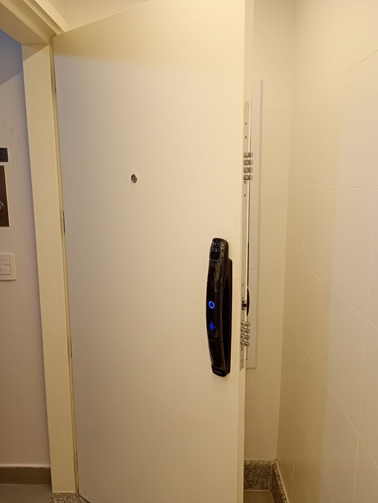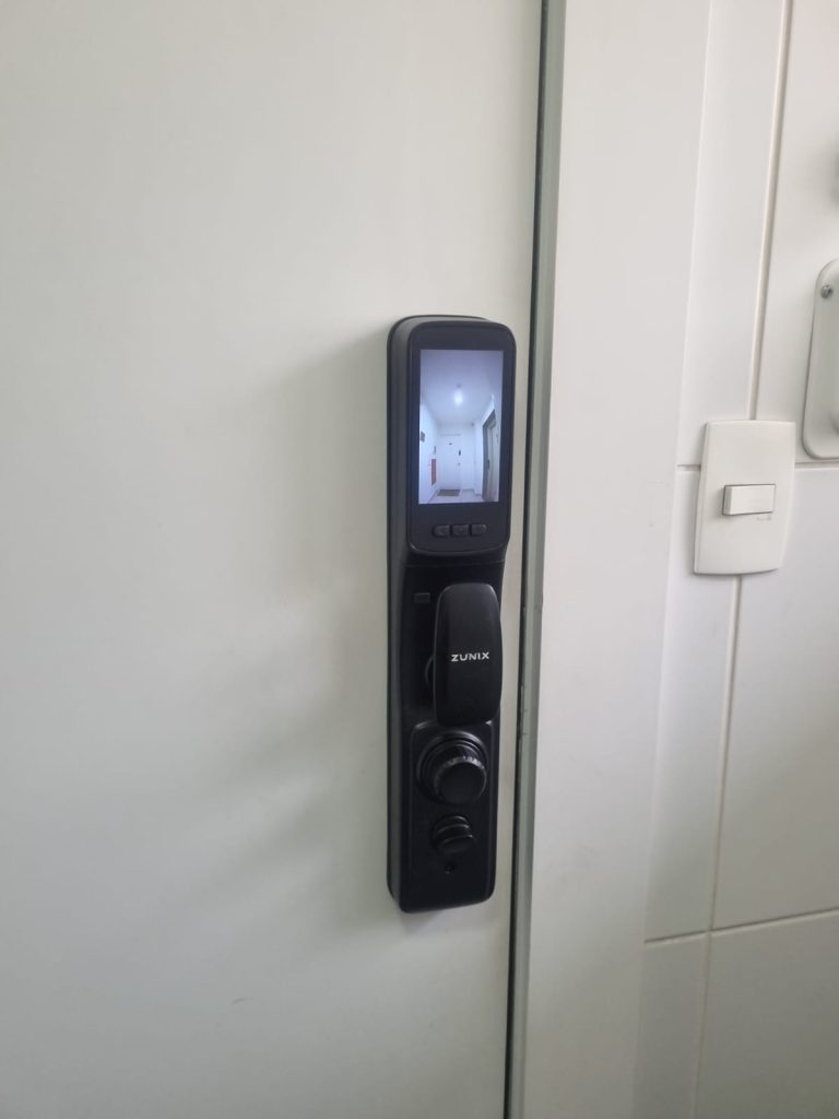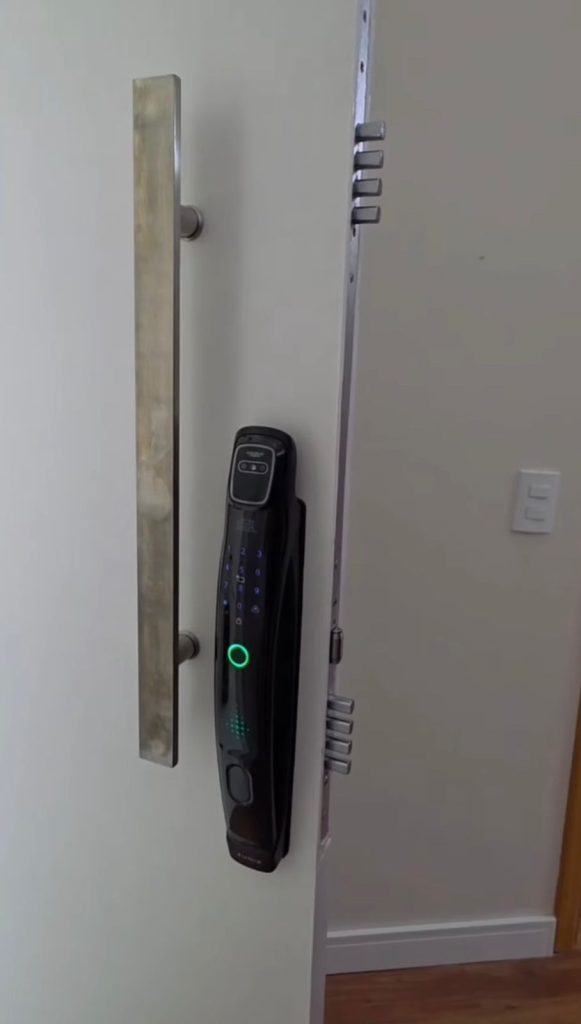 A fechadura digital possui aviso de bateria fraca e também sistema de abertura de emergência.
