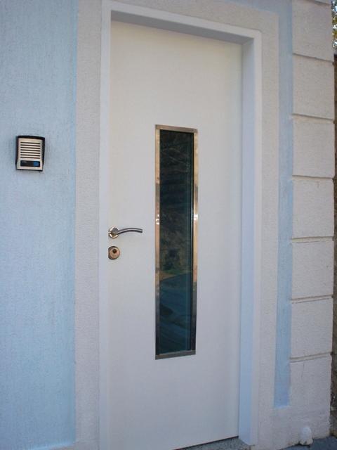 O vidro utilizado é o vidro blindado certificado, integrado à estrutura reforçada da porta, para garantir resistência e segurança contra tentativas de invasão.